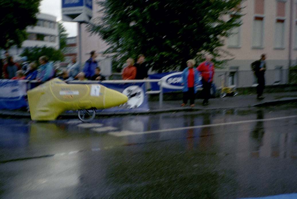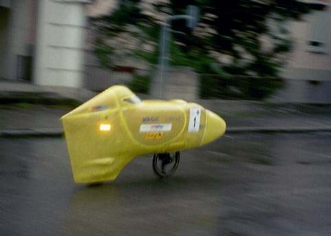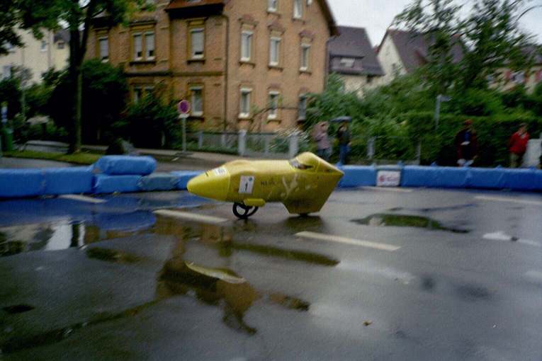 Als nächstes war dann das Rundstreckenrennen angesagt! Es gab zwei Gruppen mit jeweils etwa 30 Startern, Renndauer 1,5 Stunden. Ich rechnete bei diesem Kurs mit so vielen Fahrern mit dem Schlimmsten und daher war mein oberstes Ziel, sturzfrei zu bleiben. Schließlich hatte ich ja meine Freundin dabei, die mich möglichst in einem Stück wieder mit heim nehmen wollte. Den Start erwischte ich erwartungsgemäß schlechter als die Unverkleideten und mußte von vorne herein der Meute hinterherfahren, was sich gerade in den Kurven als extremes Handicap herausstellte. Die höhere Masse durch die Verkleidung sowie weniger Atemluft und schlechtere Sicht verhinderten dann auf den relativ kurzen Geraden ein Überholen der Führenden. Lange Zeit auf ca. Platz 5 bin ich dann schließlich die letzte halbe Stunde ohne Aussicht auf einen Sieg nur noch mitgefahren und auf Platz 10 zurückgefallen. ![]() . Die Räder hatte ich dann eigentlich schon wieder eingepackt, da hörte der Regen plötzlich auf und ich bereitete mich in einer Blitzaktion doch noch auf einen Start vor. Nachdem mich der schmale Radweg zum Start durch die beschlagene Scheibe fast zum Wahnsinn getrieben hat, konnte ich dann ohne mich eigentlich warmgefahren zu haben, einen ordentlichen Lauf hinlegen : 71,5 km/h. Zweiter Rang nach Hans Wessels mit 72,1 km/h. Beim zweiten Lauf war die Scheibe dann noch mehr beschlagen. Nach kurzem Antritt wollte ich das Stützfahrwerk einziehen und bemerkte beim nächsten Abkippen nach rechts, daß es wohl ein wenig zu früh war: Bevor ich irgendwie reagieren konnte, lag ich schon auf der rechten Seite und schlitterte Richtung Straßenrand. Die Verkleidung hatte erstaunlicherweise kaum Kratzer abbekommen ( wohl auch dank der nassen Fahrbahn ), allerdings funktionierte das Fahrwerk danach nicht mehr richtig, sodaß ich meinen zweiten Lauf leider abblasen mußte. Leider war diese WM zu sehr in Richtung Alltagstauglichkeit gegangen, wodurch die Kurse bis auf den 200m-Sprint nicht für Vollverkleidungen geeignet waren. Demzufolge gab es in dieser traditionellen Königsklasse der HPVs nur extrem wenig Konkurrenz. So wenig, daß diese Klasse eigentlich hätte gecancelt werden müssen, was aber gerade auch für die Zuschauer sehr traurig gewesen wäre. Bleibt also zu hoffen, daß die nächste WM bzw. EM wieder rennmäßiger ausgelegt wird und sich dann durch mehr Teilnehmer auch erst gar keine Probleme mehr ergeben können bezüglich minimale Teilnehmerzahl einer Klasse. |